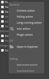 Actions in QML are arranged in a menu with optional customisable groups and separators. Actions with any kind of implementation error show up as well, including a helpful error message for simplified debugging.